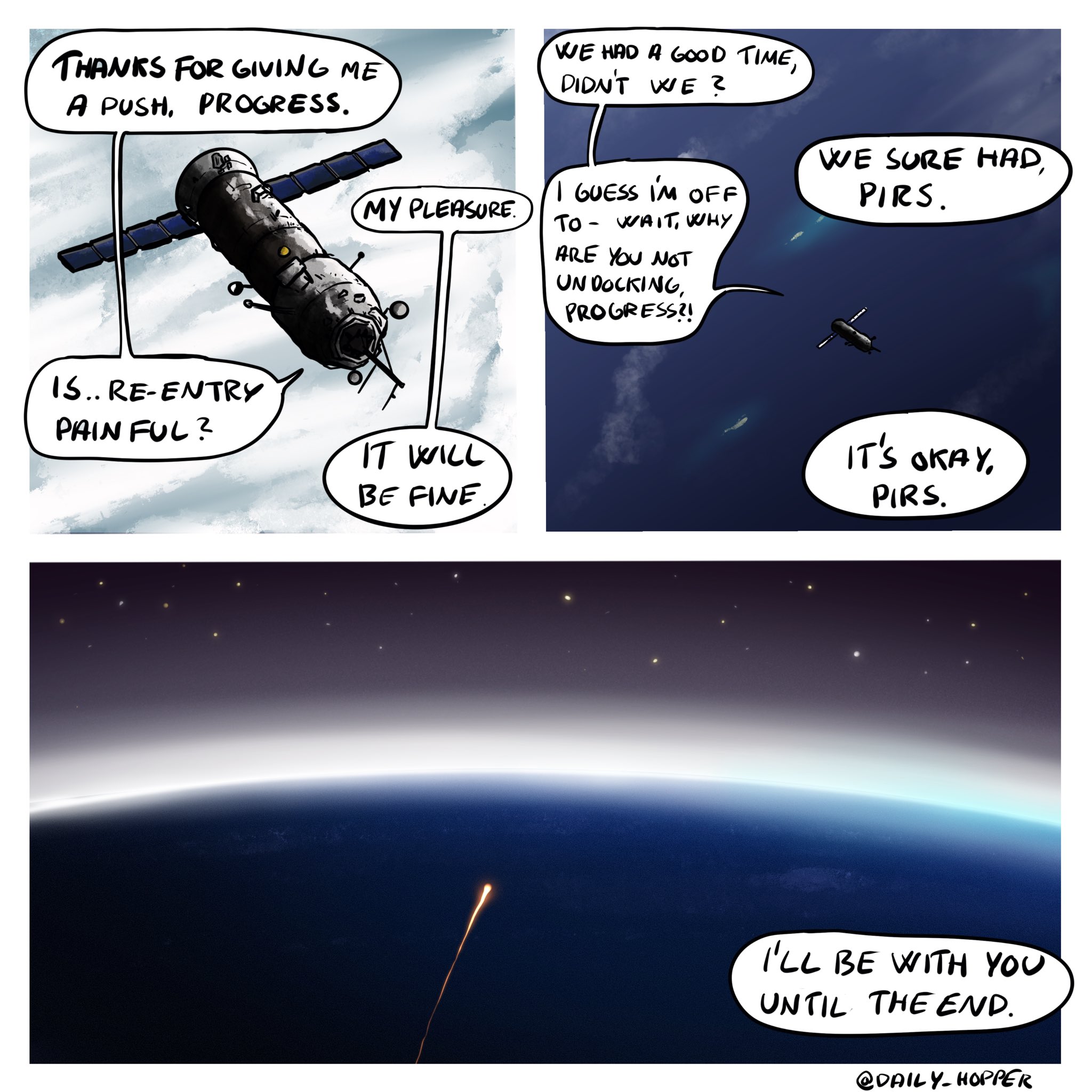 Roscosmos photo from the Station showing Progress and Pirs burning up over the Pacific, heading out of night into the orbital sunrise. Even spacecraft have dreams of heaven... beautiful and poignant...