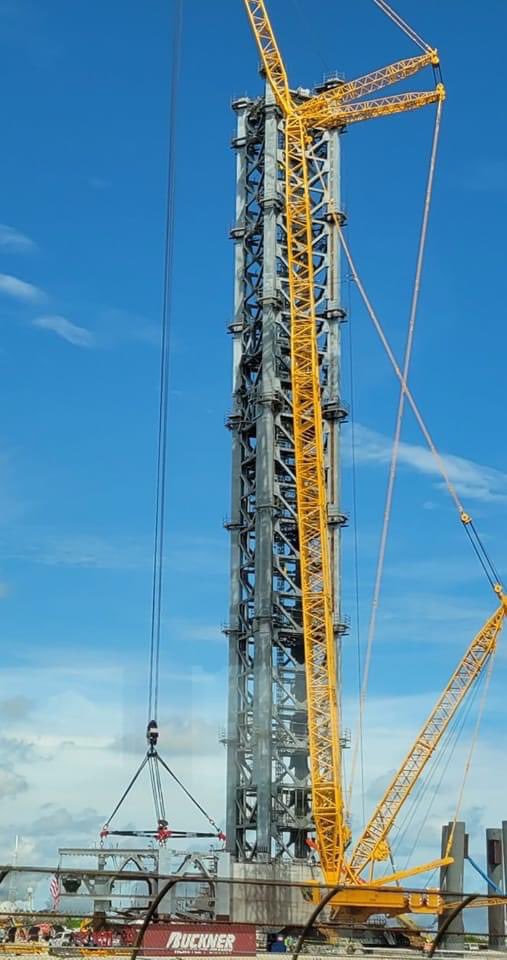 The final segment has been lifted to the top of the Cape Canaveral Starship Orbital Launch and Integration Tower