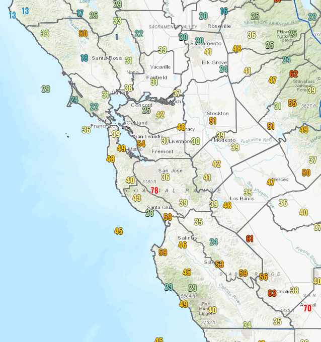 Wind speeds from the national weather service (the red 78 in the middle is the top of a mountain in the Santa Cruz Mtns.)
