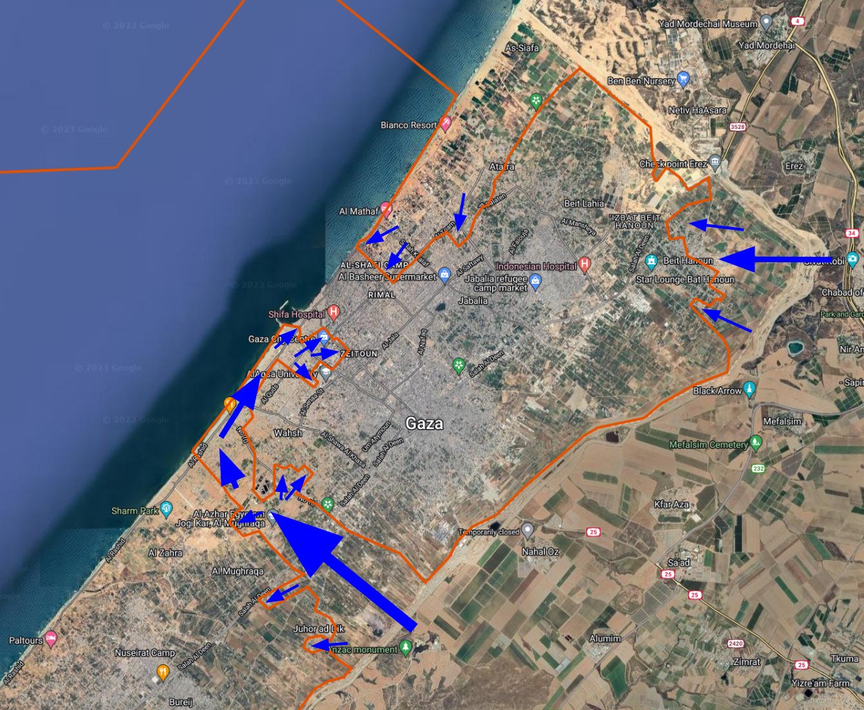 Again judging by the map, it looks like the Israelis are concentrating on attacking the densest commercial parts of the city and have so far bypassed most of the (partly evacuated) residential areas. They probably hope that they can weaken Hamas that way without destroying everyone's homes.