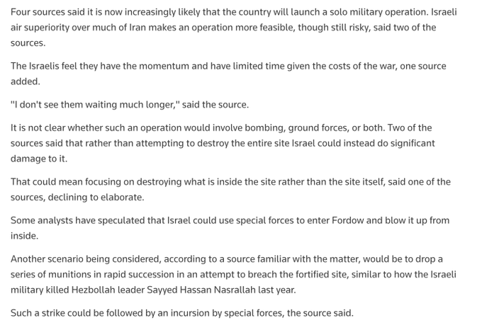 I've read that Israel does have the possibility of destroying Fordow, but it would take many more passes with their penetrating bombs in the hopes of reaching the depth of that reinforced bunker.