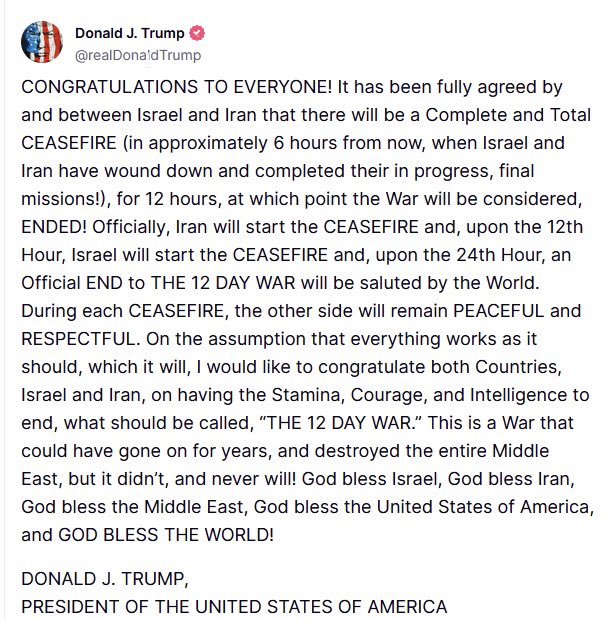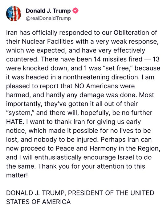 (Jun 23, 2025 07:41 PM)stryder Wrote: Trump and the International community want Iran to come back to the table in regards to where to go from here and Peace, however if they had not retaliated in any way, it would lead to people constantly worrying about where, when and how they would retaliate. It would even make it difficult to be diplomatic for that reason.