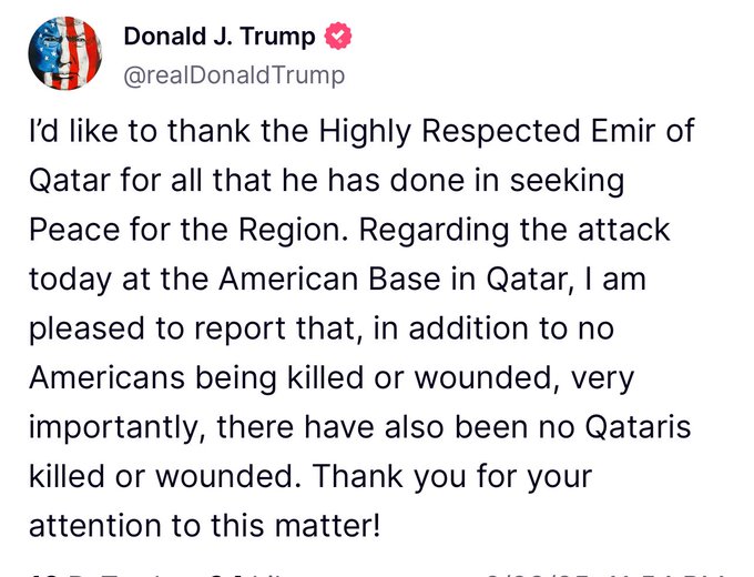 (Jun 23, 2025 07:15 PM)Syne Wrote: Iran reportedly coordinated the attack with Qatar... you know, the funder of Al Jareeza, etc..