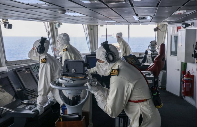 The white bunny suits the British sailors are wearing are flash-gear, designed to protect personnel from flash burns from exploding ordinance. The US Navy uses them too.