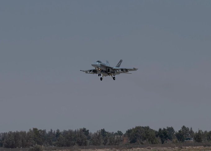 US Navy F-18's from Strike Fighter Squadron 25 "Fist of the Fleet" (VFA-25) normally based at Naval Air Station Lemoore in California, landing at Muwaffaq air base in Jordan. Presumably they are being deployed here tasked with shooting down Iranian drones on their way to Israel or attacking Jordan for helping Israel.
