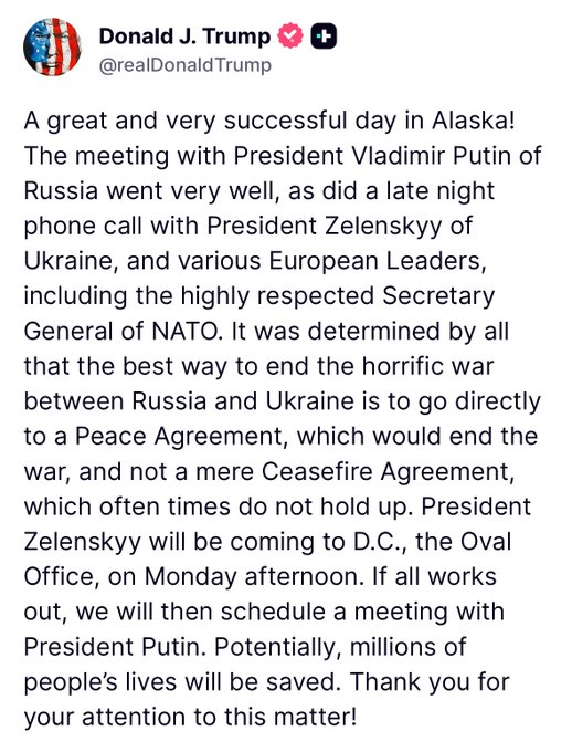 (Aug 16, 2025 06:33 PM)Syne Wrote: You have to offer Putin a carrot, not just demand he accept the Russian losses without any gain of territory. These talks, including an upcoming talk with Zelenskyy, are trying to stop the bloodshed sooner than secondary sanctions could... which is the only pressure Trump can apply. I'm sure Trump reminded Putin of this eventuality.