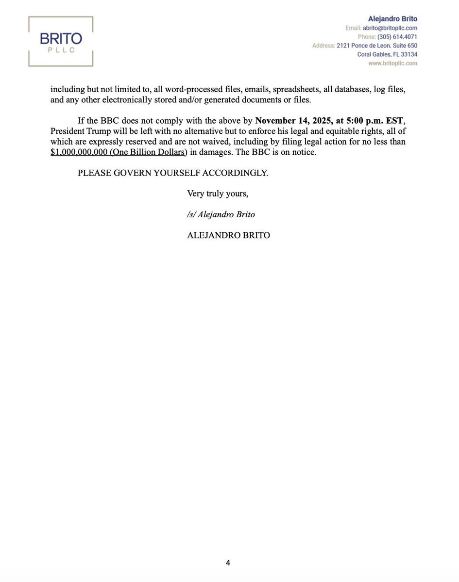 Last two pages of the demand letter that President Trump's attorneys served on the BBC People are saying that this puts the BBC in the unenviable position of either settling on President Trump's terms, or else opening up all of their internal communications regarding him to discovery. FAFO in the flesh