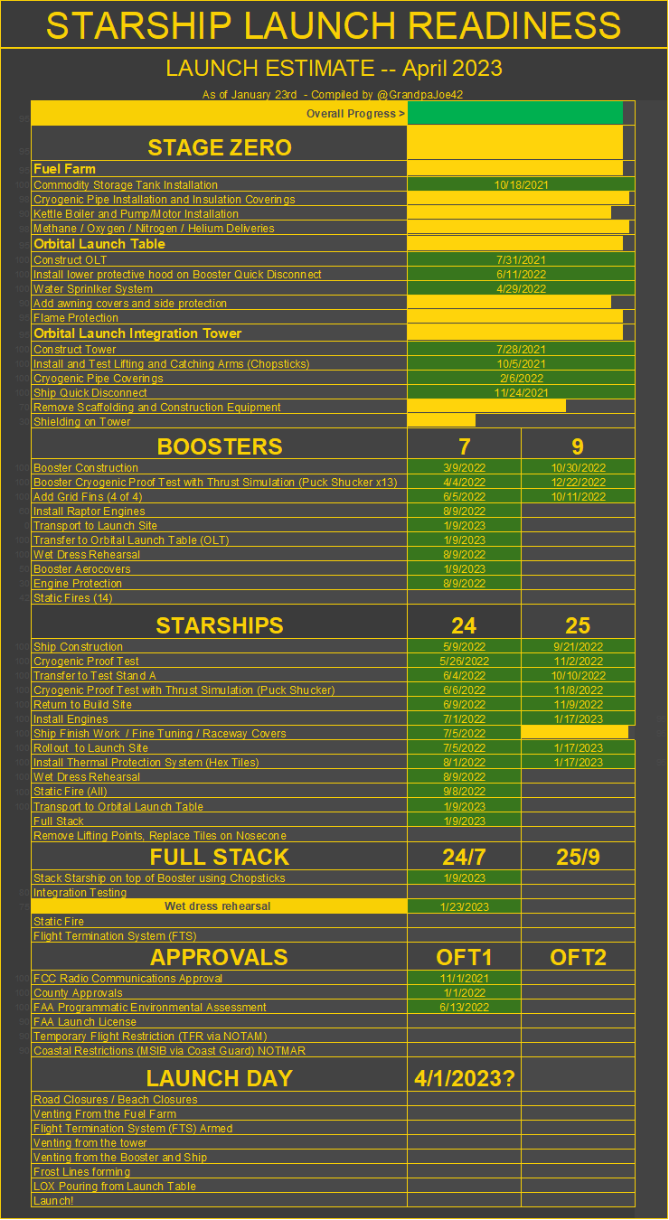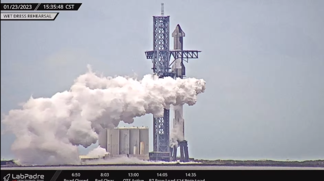 Expectation that tanking tests of the full-stack in which it is completely filled with live propellants (5,000 tons worth!) will take place at Starbase on Monday January 23, with a backup day Wednesday January 25.