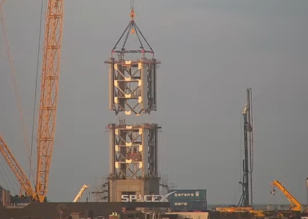Yesterday (Thursday July 26) they stacked the fourth segment of the second tower. Then last night they rolled the fifth segment from Sanchez where it was being prepped, a mile down the road to the launch area.