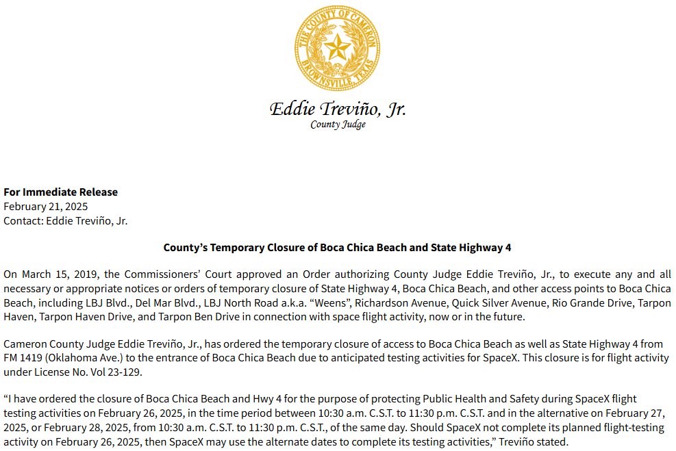 And today, the Cameron County Judge set the election on the incorporation of Starbase as a Texas municipality for Saturday May 3. If approved (it will be) Starbase will be the first new municipality in Cameron County since Los Indios in 1995.