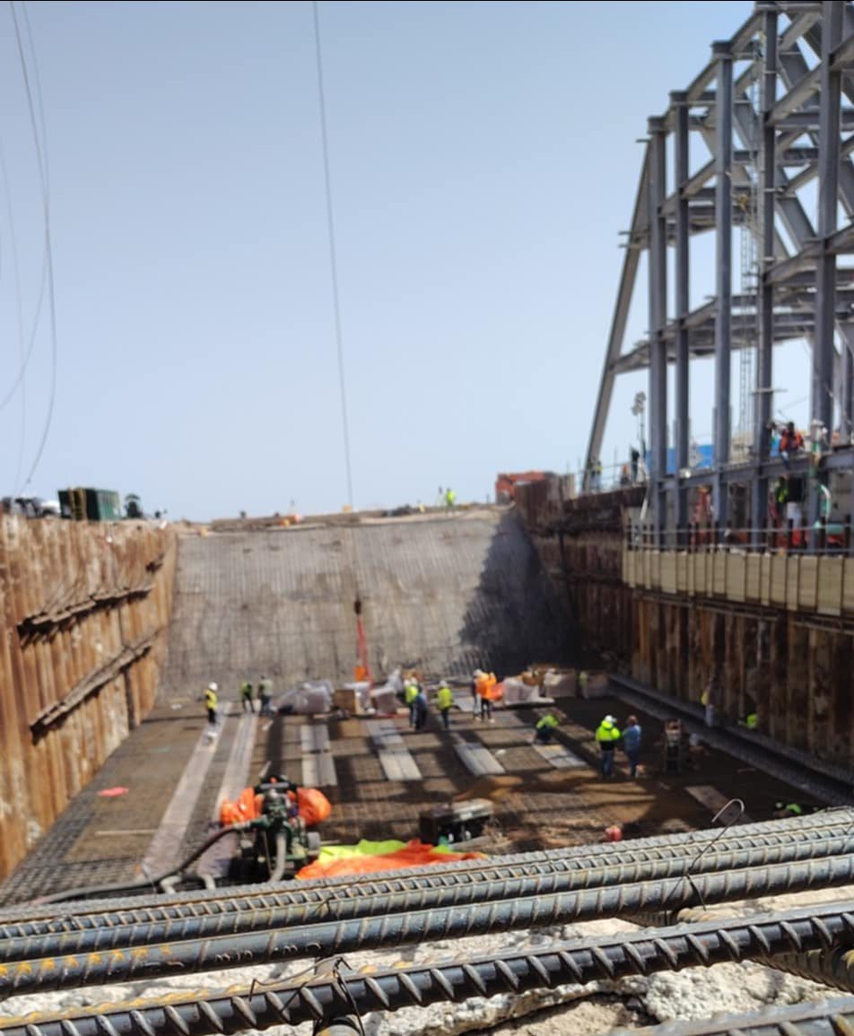The first phase of the concrete pour is completed. All they filled was the flat floor of the trench, not the sloping ends or the walls on either side. So several more big concrete pours remain. Big sections of double armor plate are being installed and welded together into trench walls that will be filled with concrete.