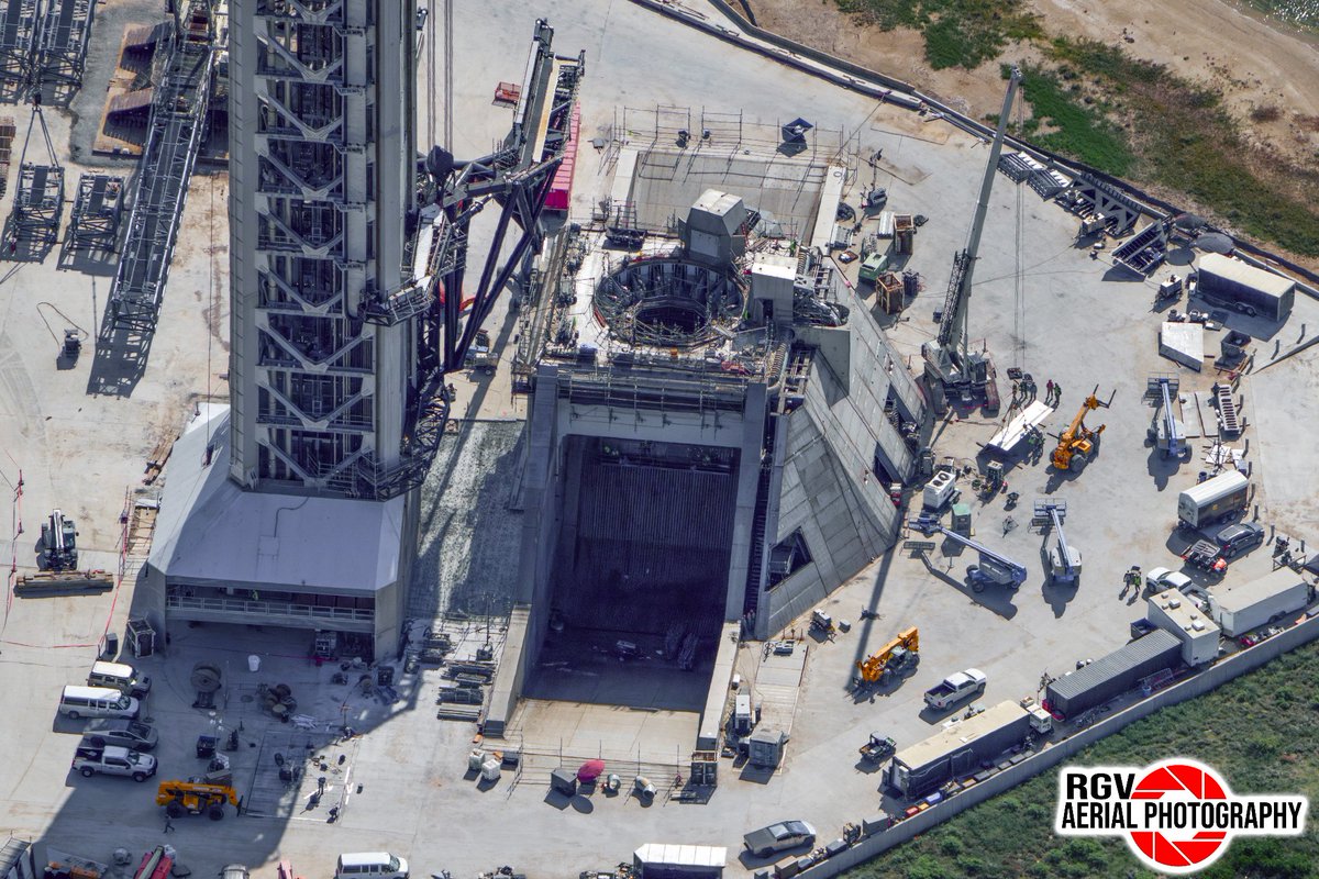 The Pad 2 launch mount and flame trench, nearing completion. They plan to rebuild Pad 1 to this design. Another pad just like this is currently under construction at Pad 39A at Kennedy Space Center at Cape Canaveral, while two more are planned at SLC 37 at Cape Canaveral Space Force Station. For a total of five Starship launch pads. (There might be even more in the future at Cape Canaveral and maybe Vandenberg as well.) Given that Starship's lunar and interplanetary ambitions depend on orbital refueling, the Starship launch cadence is going to be very high in a few years. Today a Starship launch is a special event, in the future they will happen every few days.