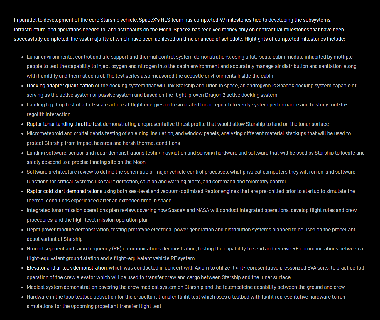 SpaceX has issued a fairly detailed account of where the HLS lander program stands: