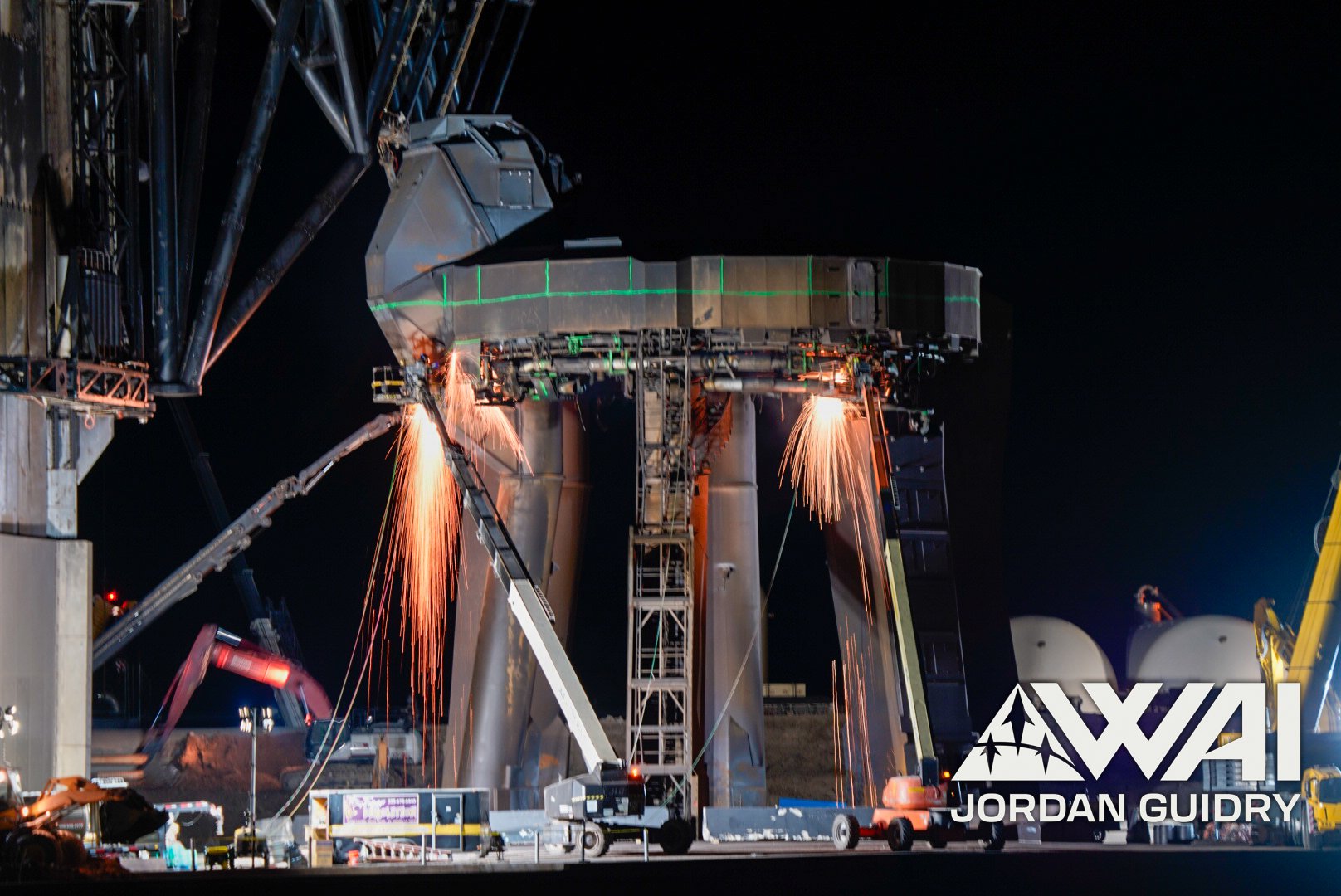 Tonight showers of sparks are falling from the Pad 1 OLM launch donut as a crew of workers with cutting torches start the big job of cutting it apart. (It seems like just yesterday we were watching it being constructed.)