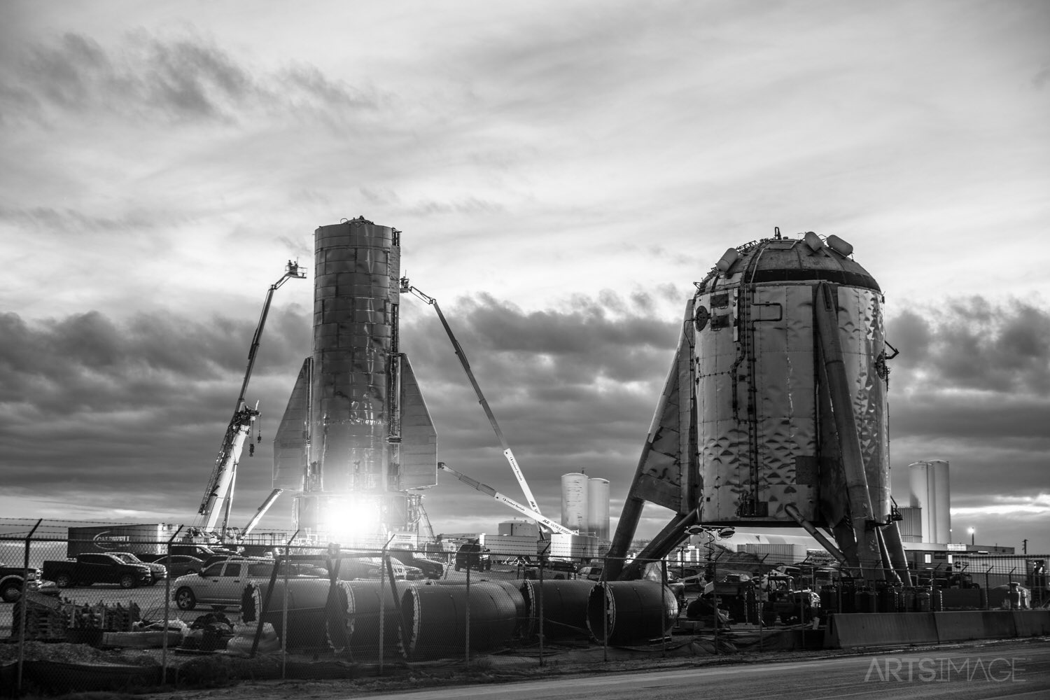 One (of many) of Mary's Boca Chica photographs, this one showing them working on attaching the bottom fins. Others show tankers arriving delivering liquid oxygen. Site preparation work at the launch area continues. Very busy.