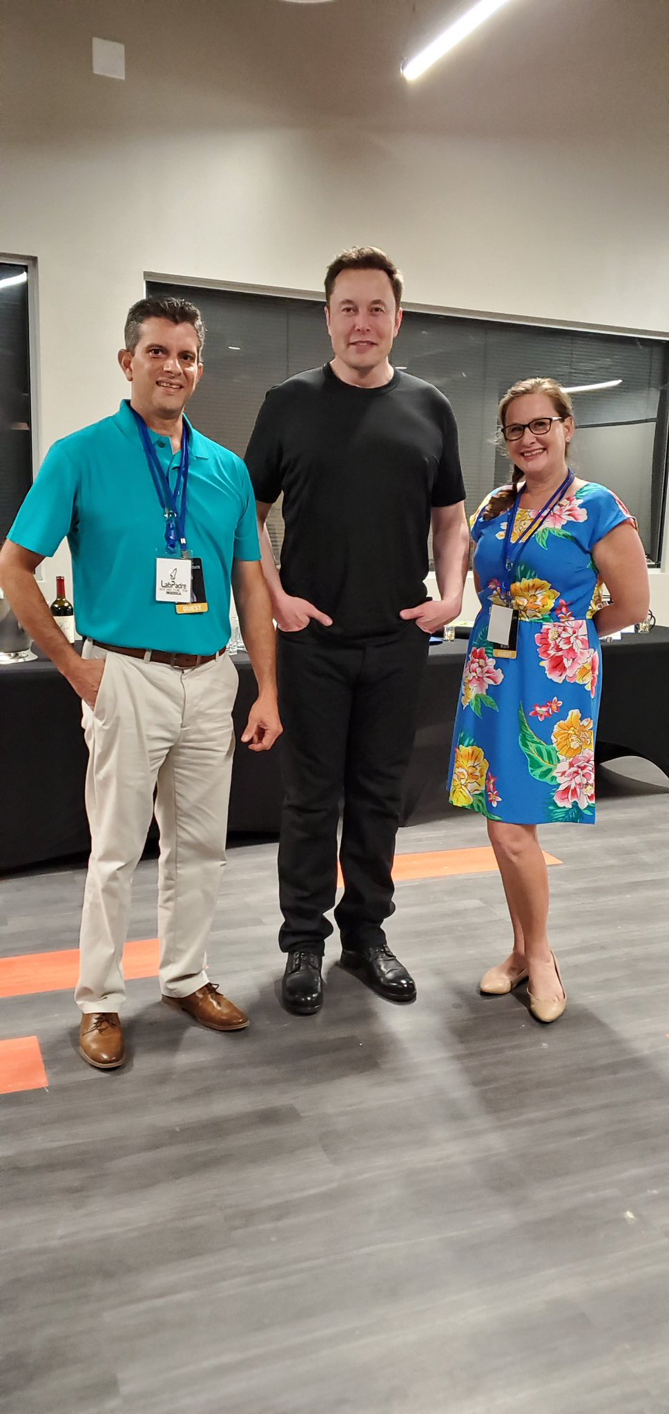 What caused the abrupt and total reversal? Everyone is saying that Elon Musk personally intervened on Lab's behalf. It's known that Elon sometimes watches Lab's streams and likes Lab. What's more, Elon is all about increasing public excitement about spaceflight and Lab brings tens of thousands of people from all around the world in virtually every country to daily personal involvement with and emotional investment in SpaceX. Lab is up there with Mary as a volunteer SpaceX publicity department. Unlike company PR flacks, the company doesn't control them. But that just lends them that much more authenticity. I think that Elon loves that alternative media aspect. (Photo of Elon with Lab and his wife.) So Elon supposedly knocked a few heads together and told his people to reach a satisfactory accommodation with Lab.