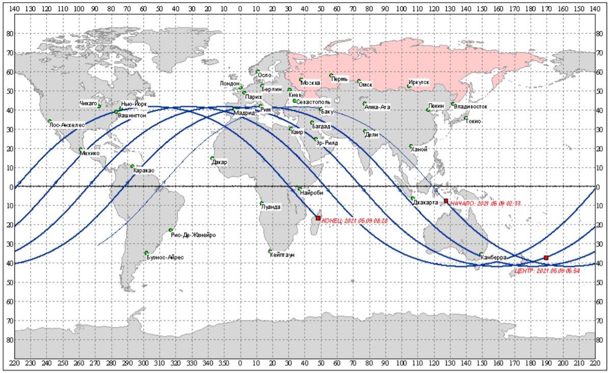 Here's it's orbital track over that time with the dark blue line showing where it might come down (Roscosmos graphic)
