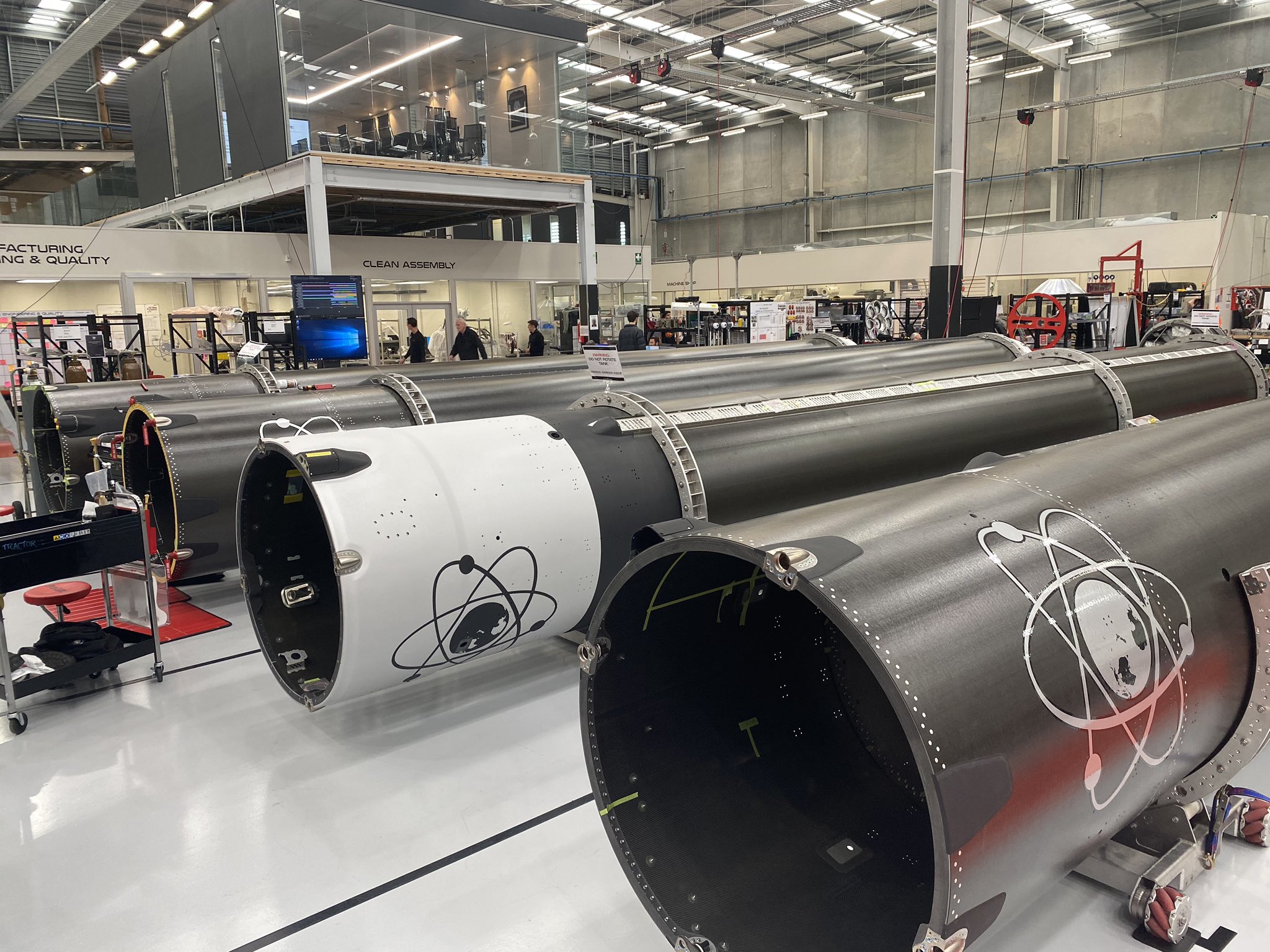 Peter Beck (Rocketlab boss) says 'Spot the odd one out, S1 recovery booster'. (Photo by Peter Beck, apparently taken in Rocketlab's rocket factory in Huntington Beach CA.)