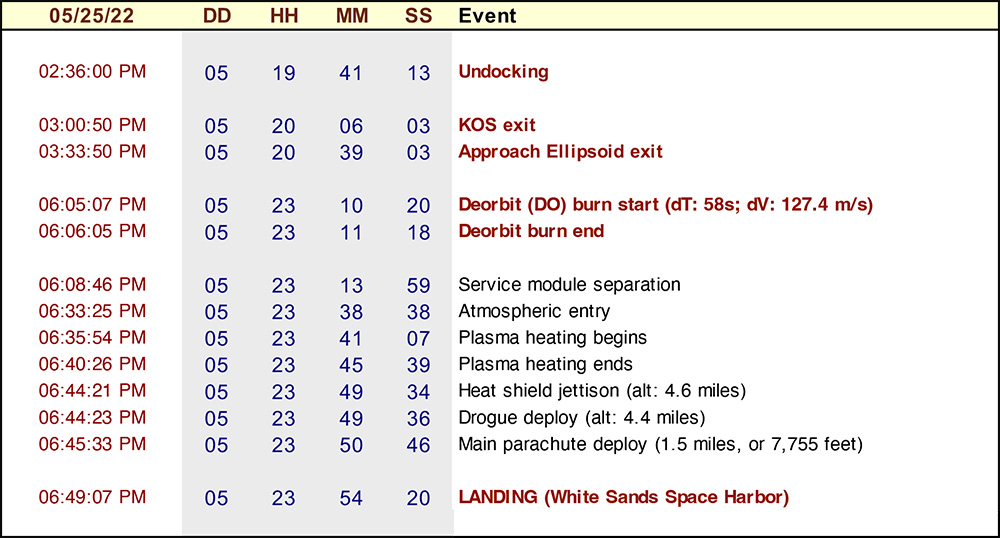 The information below is from William Harwood of CBS news. Times on left column are EDT. The middle columns are mission elapsed time.
