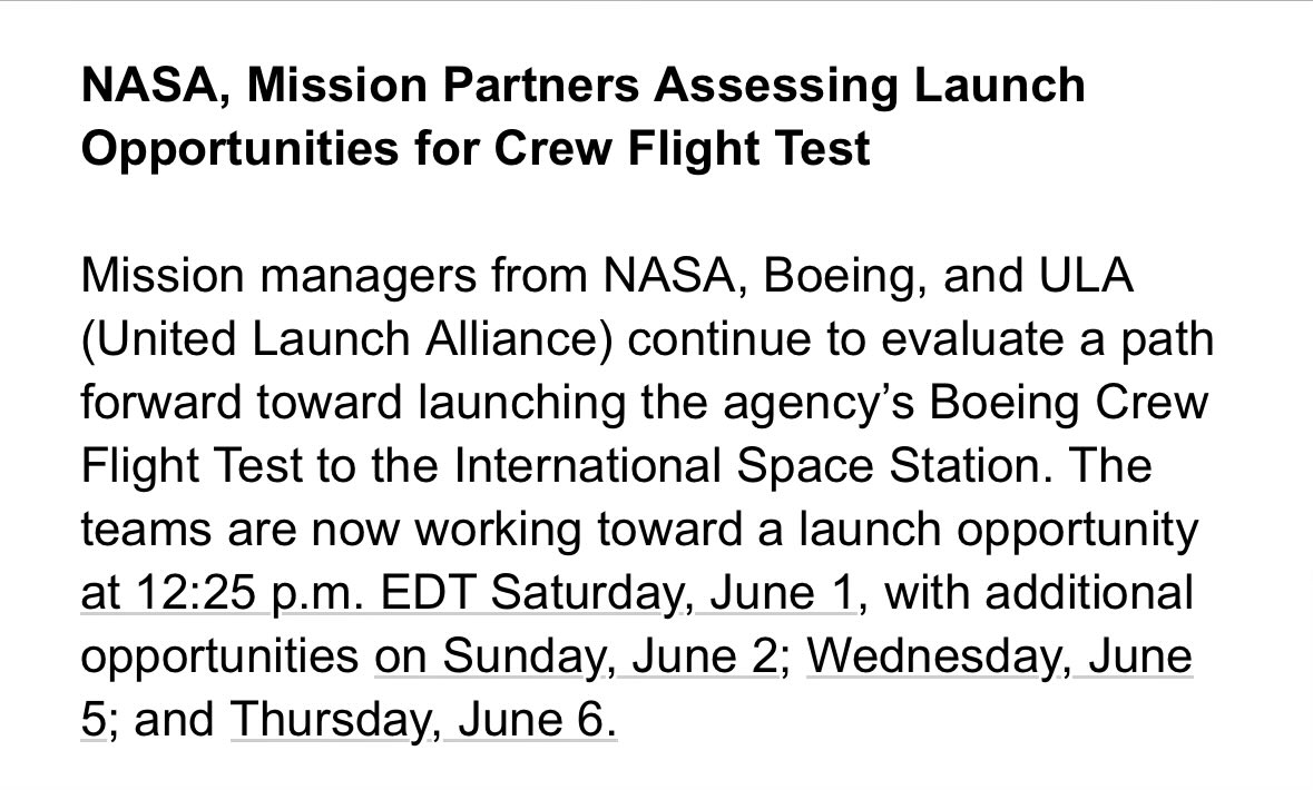 Boeing Starliner has slipped until Tues, May 21, at 4:43 pm for the launch of their Crewed Flight Test.