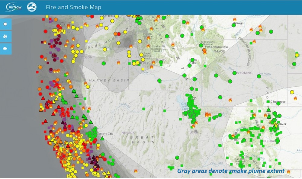 Here's an air quality map of the western United States. While smoke conditions have improved some in the SF bay area, Portland looks like it has the worst air quality in the US and perhaps the world. (Eat your heart out, Beijing! The US is Number One!!) The whole Willamette valley basin looks like it's filled with smoke. Lots of smoke in California's Sacramento valley too.