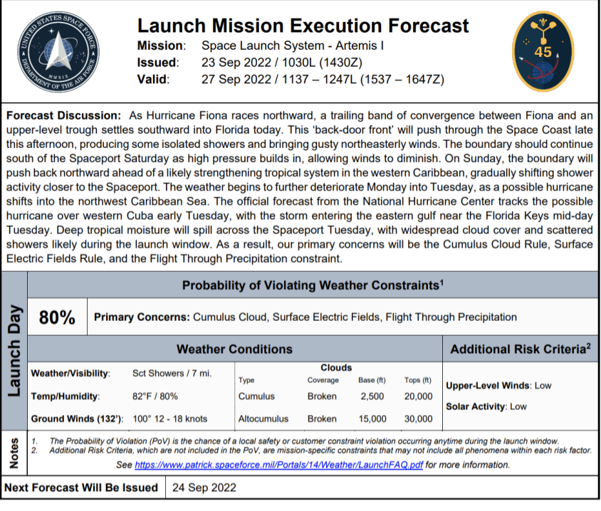 Chances of a weather scrub are now estimated to be 80%. They are currently deciding whether to roll the SLS back to the protection of the Vertical Assembly Building.
